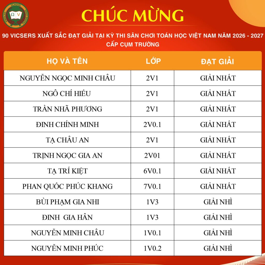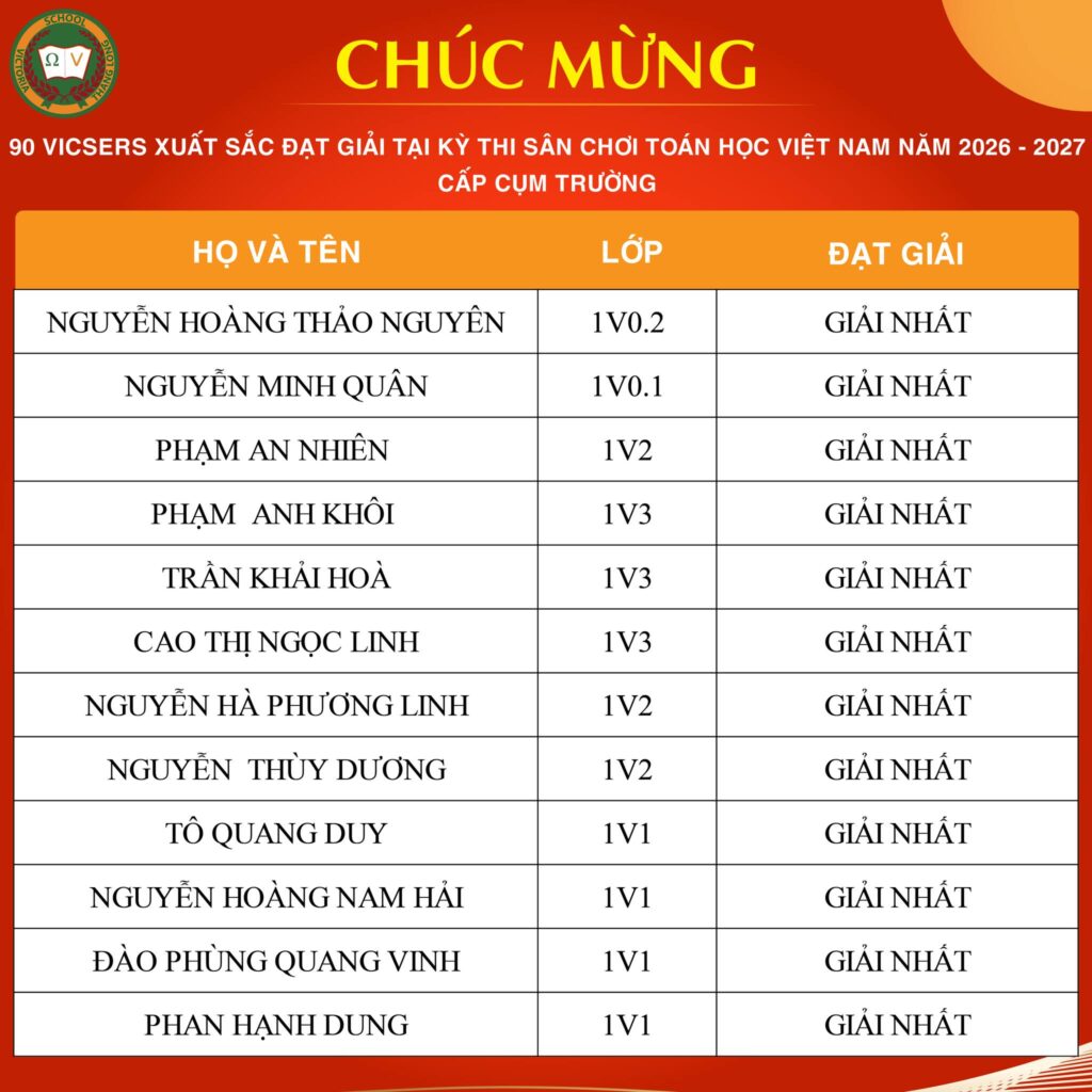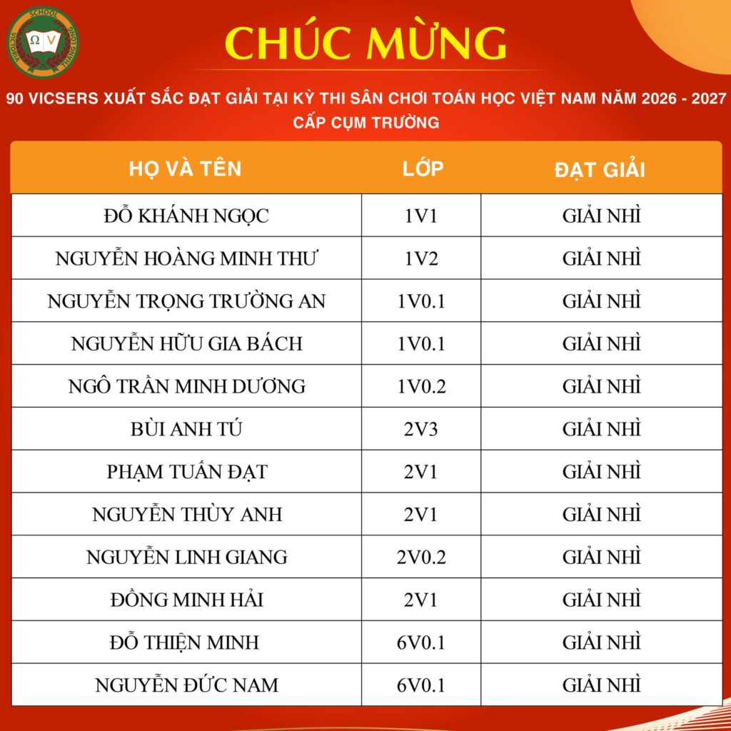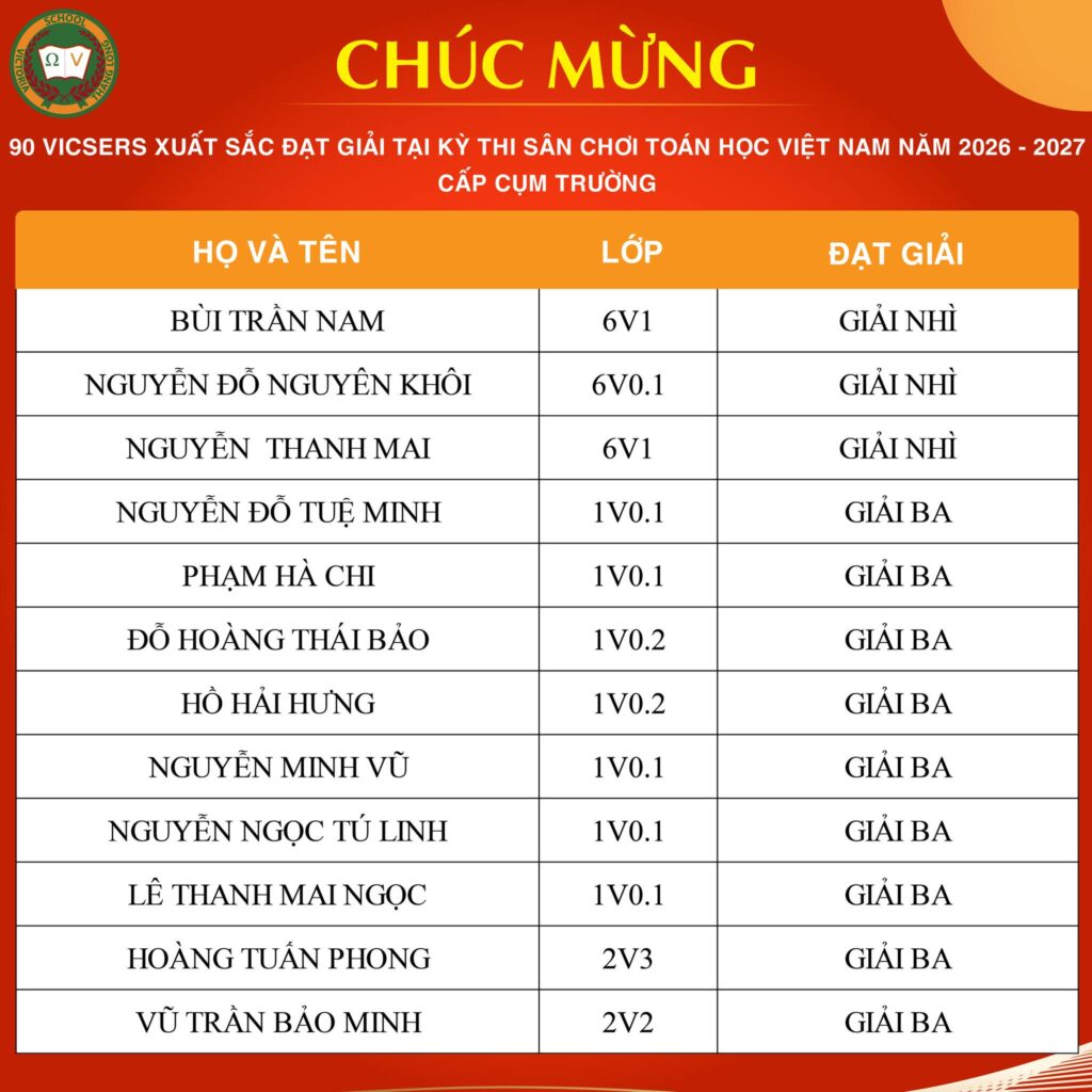 CHÚC MỪNG VICSER NGUYỄN BẢO LAM XUẤT SẮC ĐẠT IELTS 7.5Vicser Nguyễn Bảo Lam, học sinh lớp 9V1 CCS, chính thức ghi danh vào bảng vàng với IELTS 7.5 – một cột mốc học thuật quan trọng, đánh dấu hành trình học tập bền bỉ, nghiêm túc và đầy quyết tâm của Bảo Lam. Thành tích này không chỉ là kết quả đáng ghi nhận, […]
