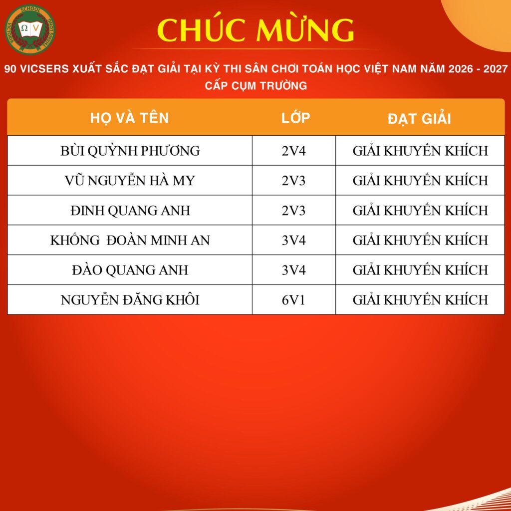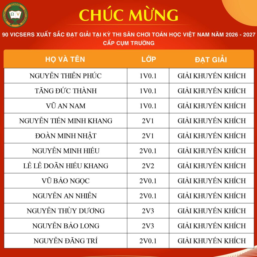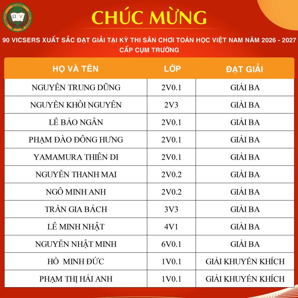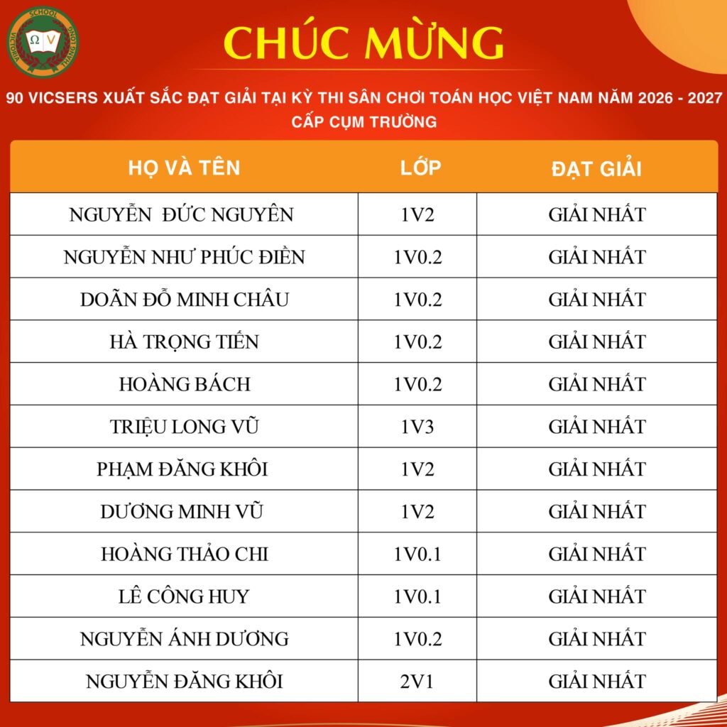 CHÚC MỪNG VICSER NGUYỄN BẢO LAM XUẤT SẮC ĐẠT IELTS 7.5Vicser Nguyễn Bảo Lam, học sinh lớp 9V1 CCS, chính thức ghi danh vào bảng vàng với IELTS 7.5 – một cột mốc học thuật quan trọng, đánh dấu hành trình học tập bền bỉ, nghiêm túc và đầy quyết tâm của Bảo Lam. Thành tích này không chỉ là kết quả đáng ghi nhận, […]