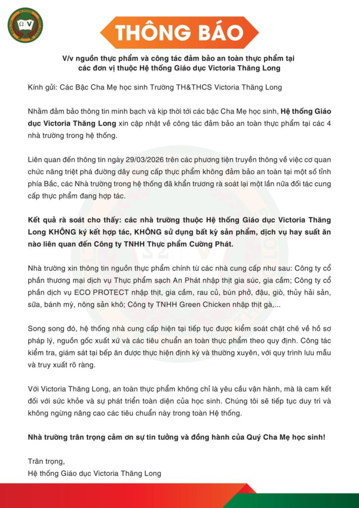 THÔNG BÁO VỀ NGUỒN THỰC PHẨM VÀ CÔNG TÁC ĐẢM BẢO AN TOÀN THỰC PHẨM TẠI CÁC ĐƠN VỊ THUỘC HỆ THỐNG GIÁO DỤC VICTORIA THĂNG LONG
